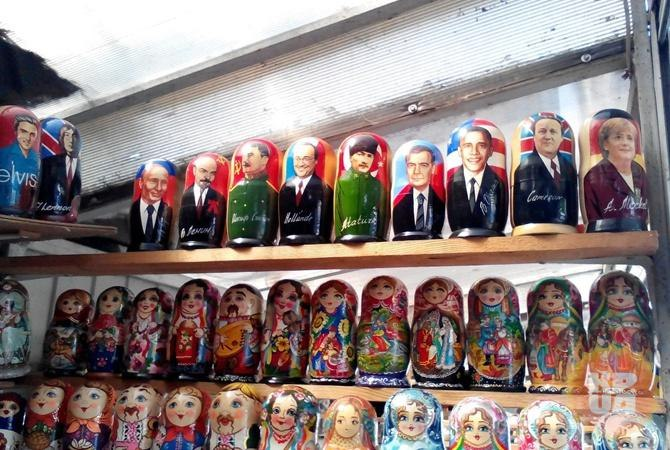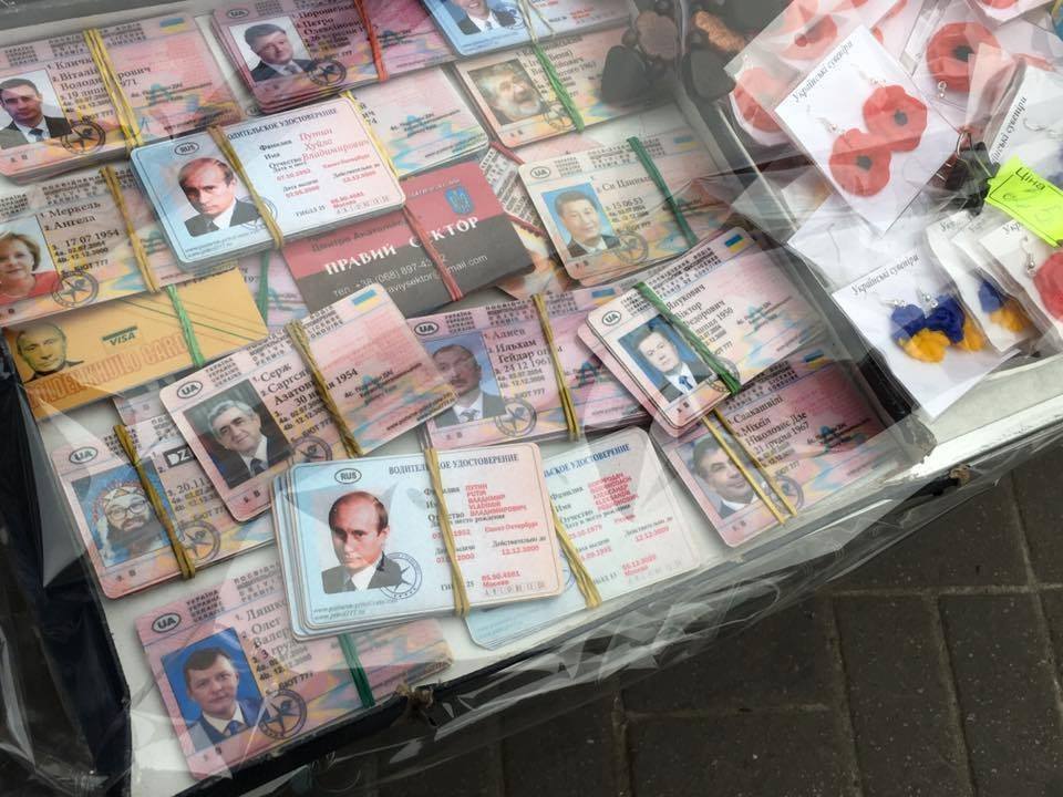"Киев "готовится" к Евровидению! На Крещатике появились сувенирные водительские права Путина. Лежат рядом с сувениркой Правого сектора. А на Андреевском спуске матрешки не лучше", - говорится в сообщении.