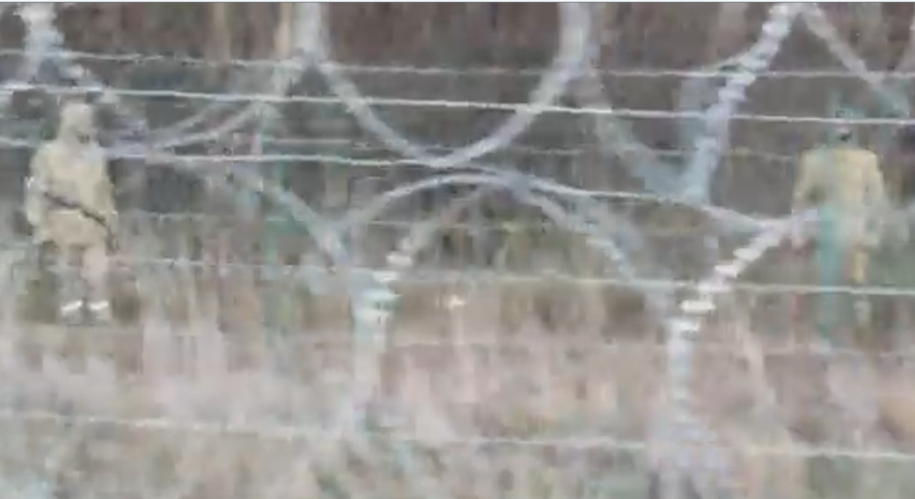 На видео, снятом польскими службами, видно, что белорусские военные стоят вдоль границы с винтовками и гранатометами.