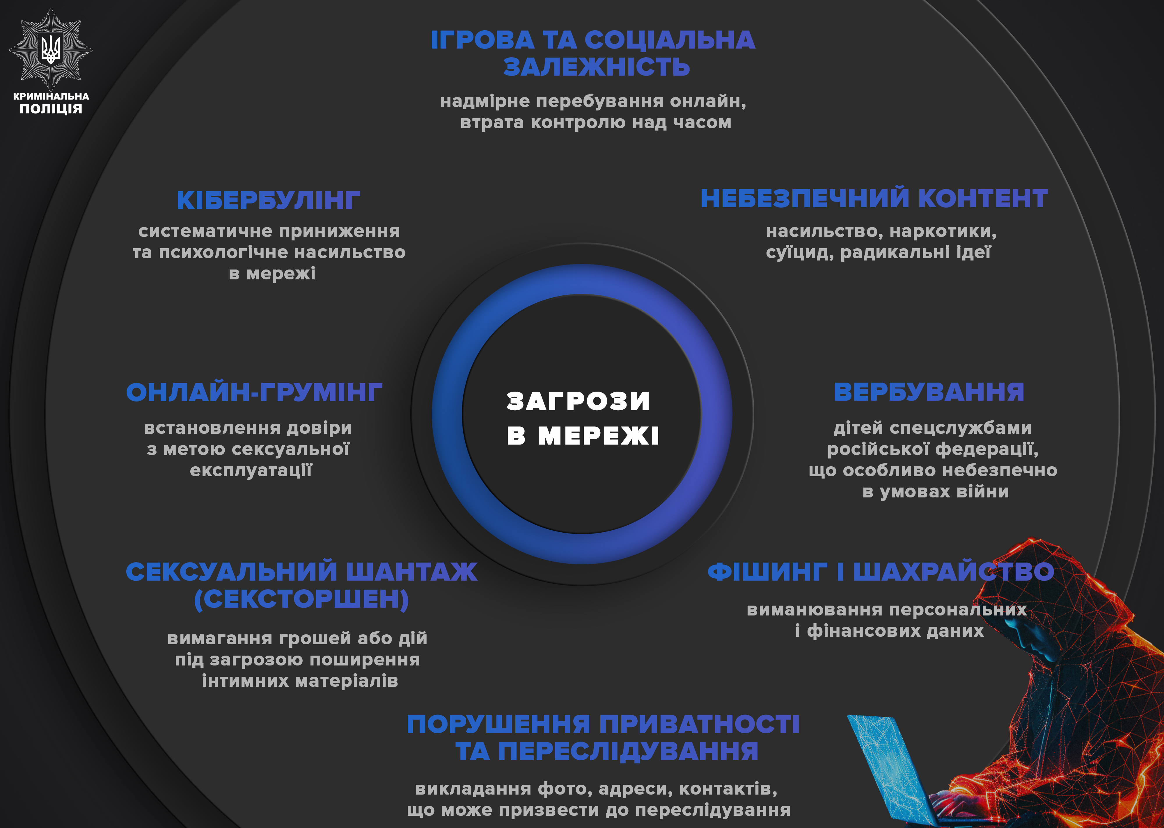Щоб захистити дітей від вербування та насильства, Нацполіція навчає їх правил безпеки в інтернеті: захисту приватності, протидії кібербулінгу, розпізнавання фейкових акаунтів та безпечного налаштування профілів. Протягом 2025 року поліцейські провели майже 200 тисяч просвітницьких заходів з учнями, педагогами й батьками.