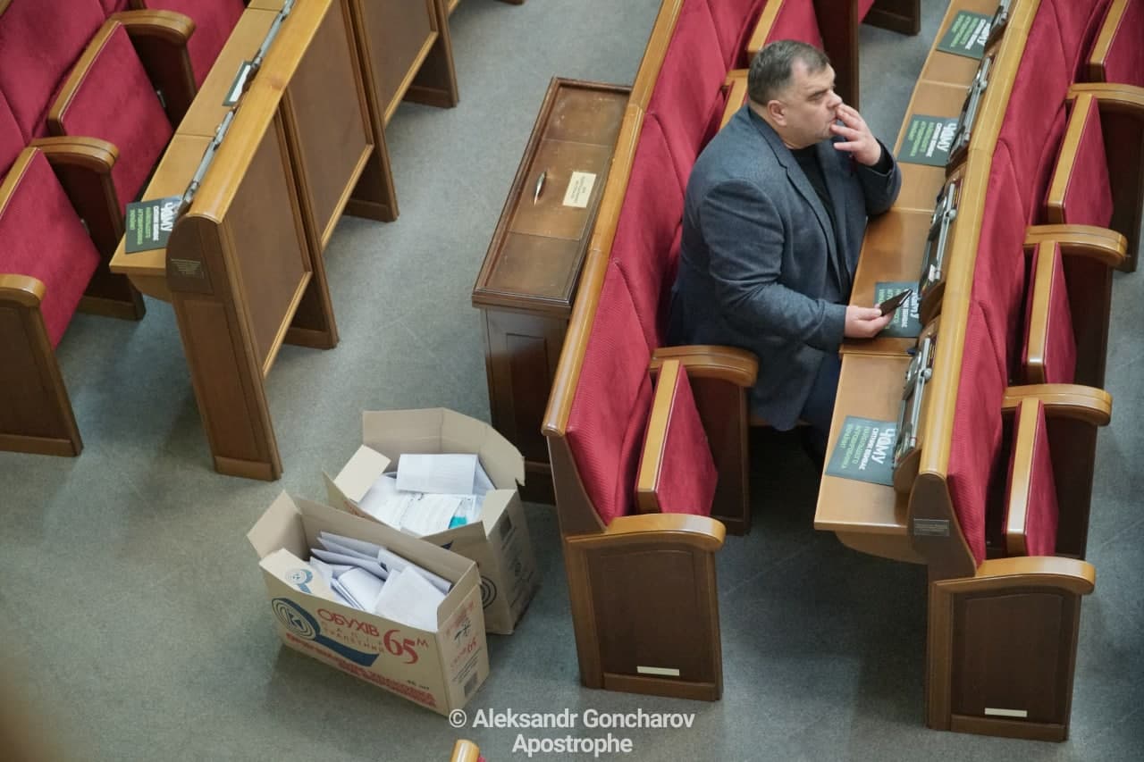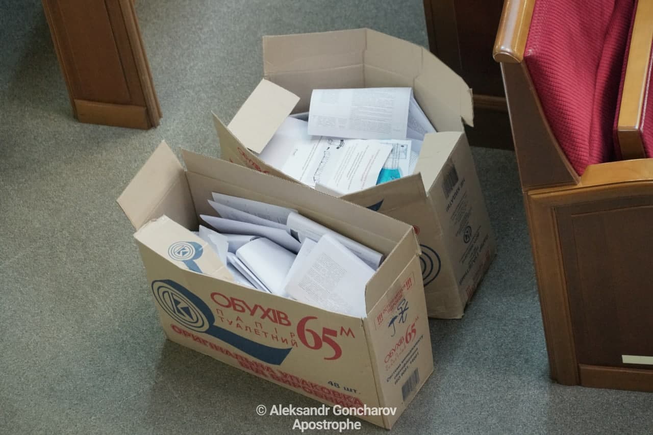 Прямо в залі засідання Верховної Ради парламентські документи збираються в величезні коробки, в яких раніше перебував туалетний папір.