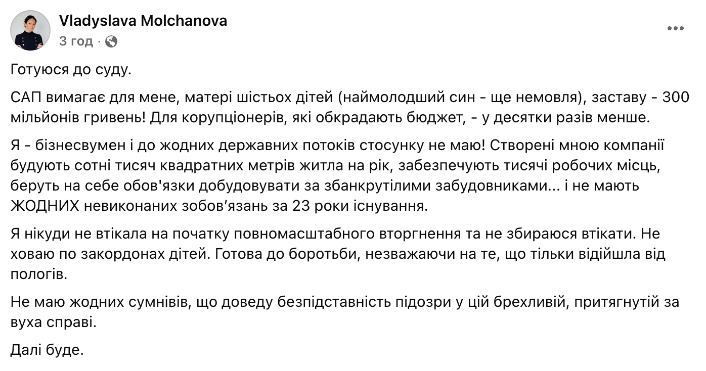 "Я – бізнесвумен і до жодних державних потоків стосунку не маю. Створені мною компанії будують сотні тисяч квадратних метрів житла на рік, забезпечують тисячі робочих місць, беруть на себе обов'язки добудовувати за збанкрутілими забудовниками... і не мають жодних невиконаних зобовʼязань за 23 роки існування. Я нікуди не втікала на початку повномасштабного вторгнення та не збираюся втікати. Не ховаю по закордонах дітей. Готова до боротьби, незважаючи на те, що тільки відійшла від пологів", – написала Молчанова.
