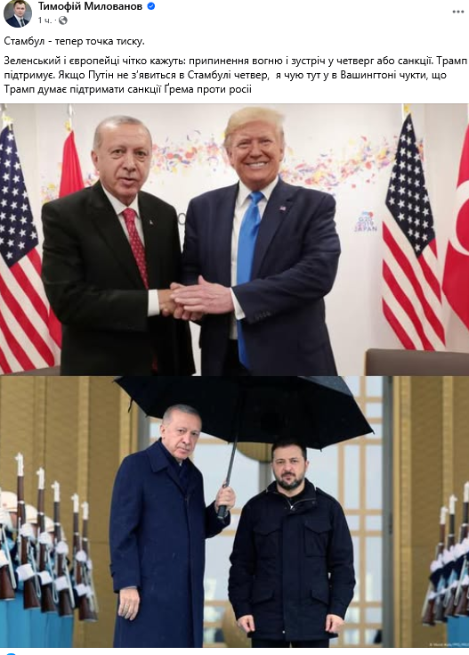 "Стамбул - тепер точка тиску. Зеленський і європейці чітко кажуть: припинення вогню і зустріч у четвер або санкції. Трамп підтримує. Якщо Путін не з"явиться в Стамбулі у четвер, я чую тут у в Вашингтоні чутки, що Трамп думає підтримати санкції Ґрема проти Росії", - повідомив він.
