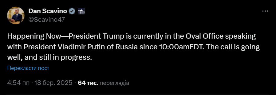Йдеться про їхню другу офіційну телефонну розмову. Перша відбулася після інавгурації Трампа 12 лютого. Під час неї сторони домовилися розпочати переговори про припинення війни в Україні.