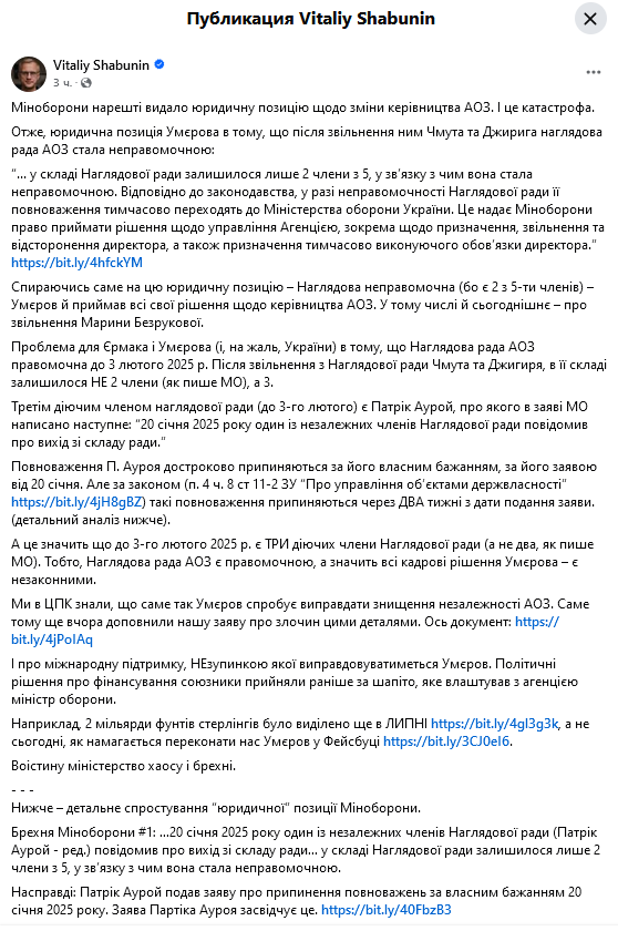 "Наглядова рада АОЗ правомочна до 3 лютого 2025 р. Після звільнення з Наглядової ради Чмута та Джигиря, в її складі залишилося не 2 члени (як пише МО), а 3", - повідомив голова ЦПК Віталій Шабунін у Facebook.