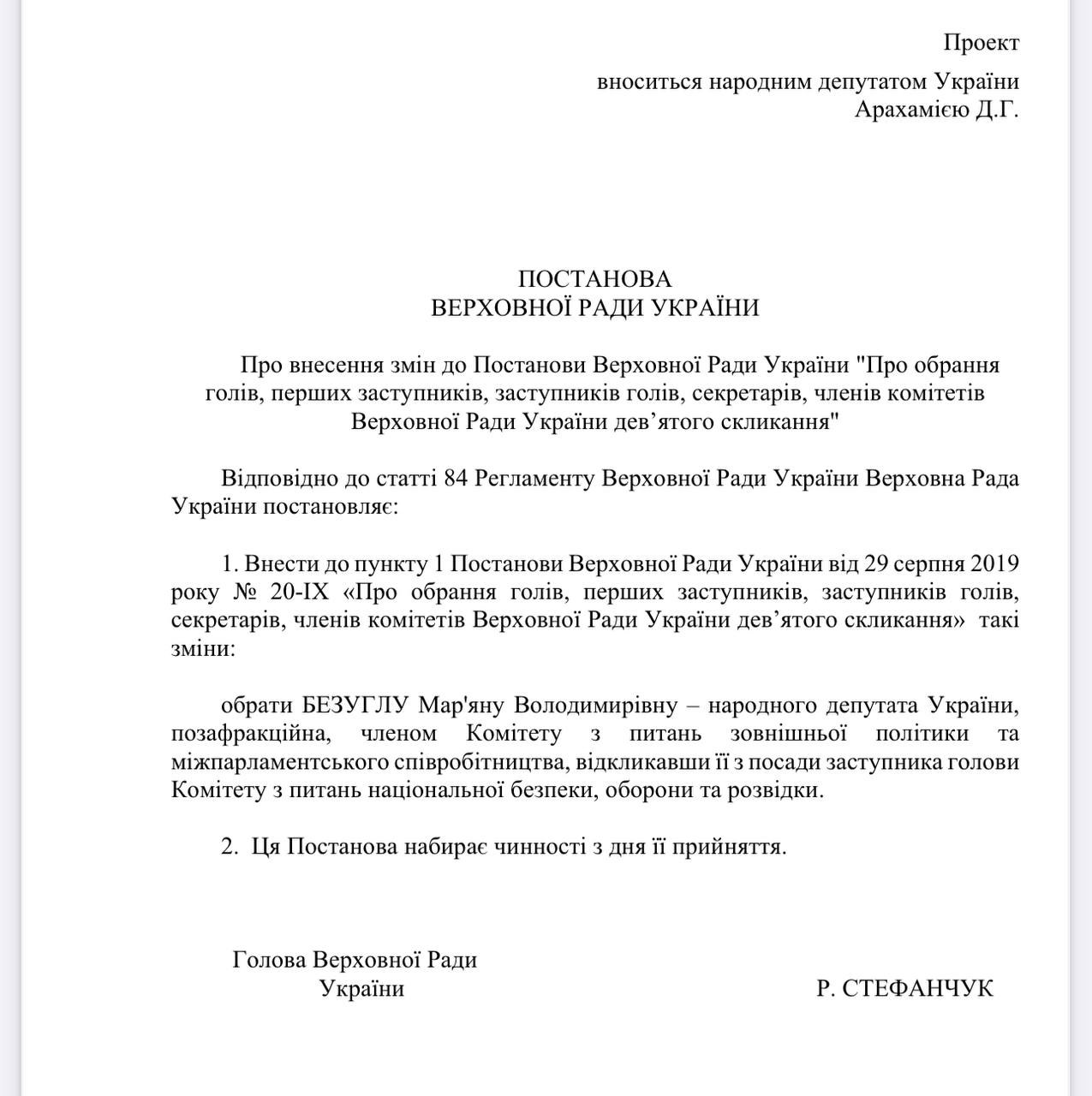 Народну депутатку Мар'яну Безуглу хочуть звільнити з посади заступниці комітету Верховної Ради з питань оборони і призначити її членом комітету з питань зовнішньої політики.