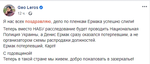 "Я нас всіх вітаю, справу по плівкам Єрмака успішно злили! Тепер замість НАБУ розслідування буде проводити Національна Поліція України, а Денис Єрмак відразу виявився потерпілим, а не організатором схеми розпродажі посад", - пише він.