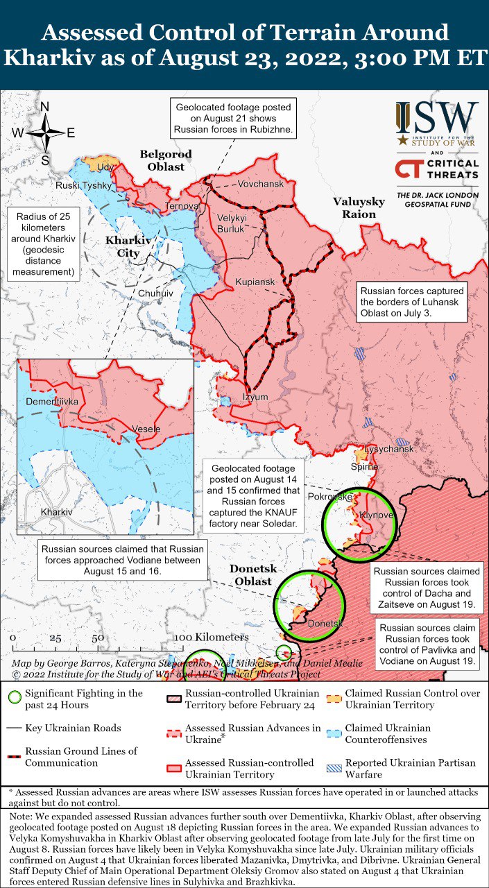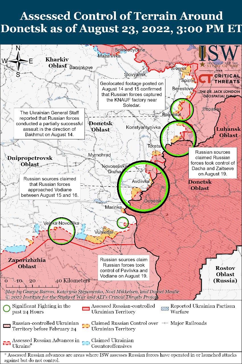 - Сили РФ провели атакували українські позиції на північний схід та південь від Бахмута, на північно-західній околиці Донецька та на південний захід від нього.