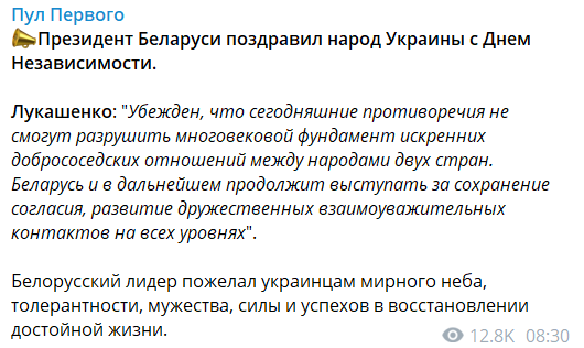 09:20 Верх цинізму. Лукашенко привітав Україну з Днем Незалежності та побажав мирного неба її громадянам.
