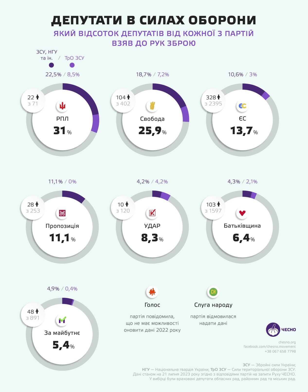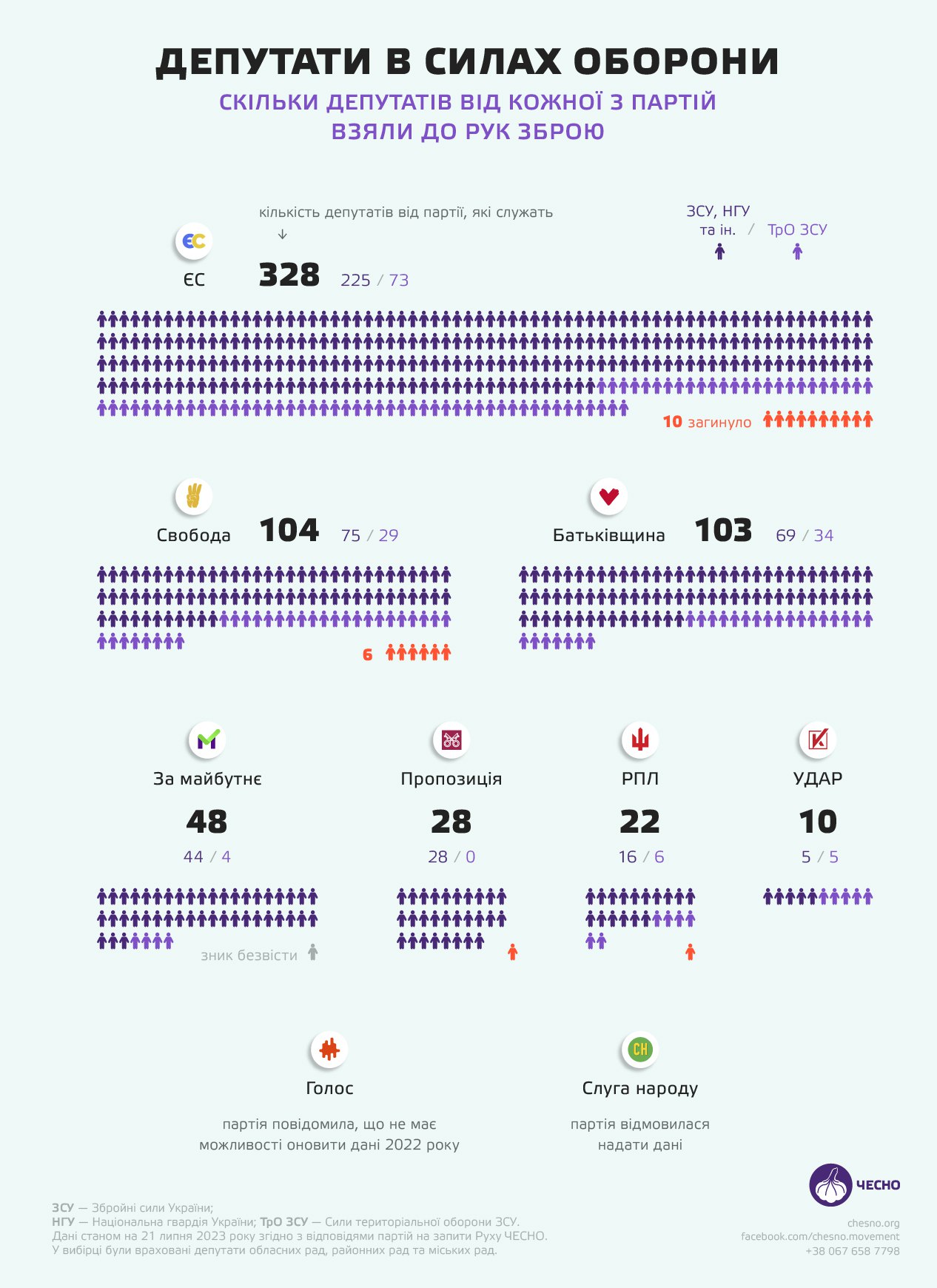 У той же час політичні партії "Українська стратегія Гройсмана" та "Слуга народу" не надали дані щодо своїх однопартійців, які перебувають у Силах оборони.