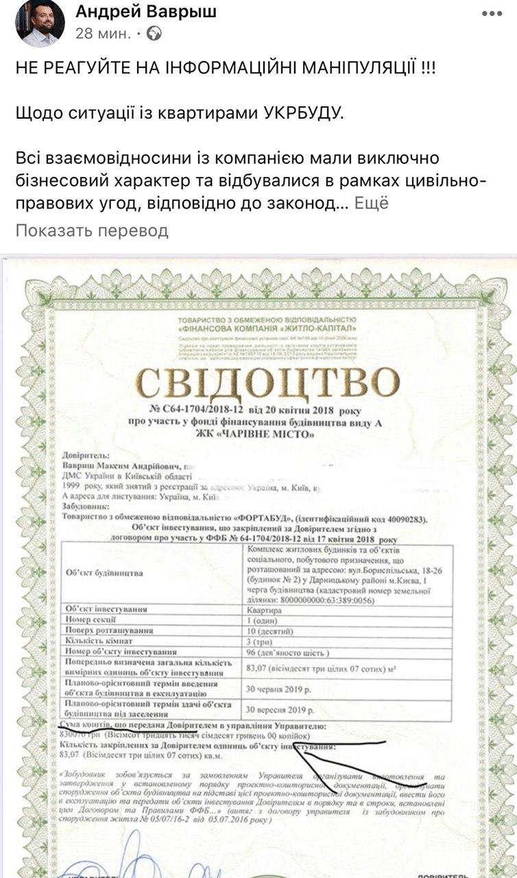 "Як я і прогнозував, платіжні документи (рух по рахунках) відсутні. У той же час, сертифікат, який опублікував Андрій Вавриш виписаний на квартиру, якої немає в моєму списку. Висновки робіть самі ... Дуже цікавий документ. Схоже, Андрій Вавриш дав додатковий матеріал для розслідування. Ціна за 1 метр значиться 10.000 гривень. Смішно. Краще б не коментував", - йдеться в повідомленні.