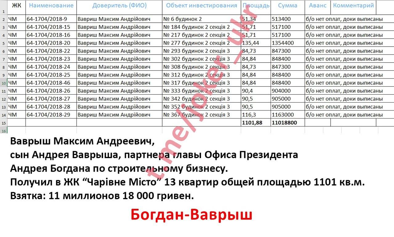 "Так, наприклад, на 18-річного Максима Вавріша - сина Андрія Вавріша (партнер Богдана) оформлено нерухомості на 11 мільйонів гривень", - йдеться в повідомленні.