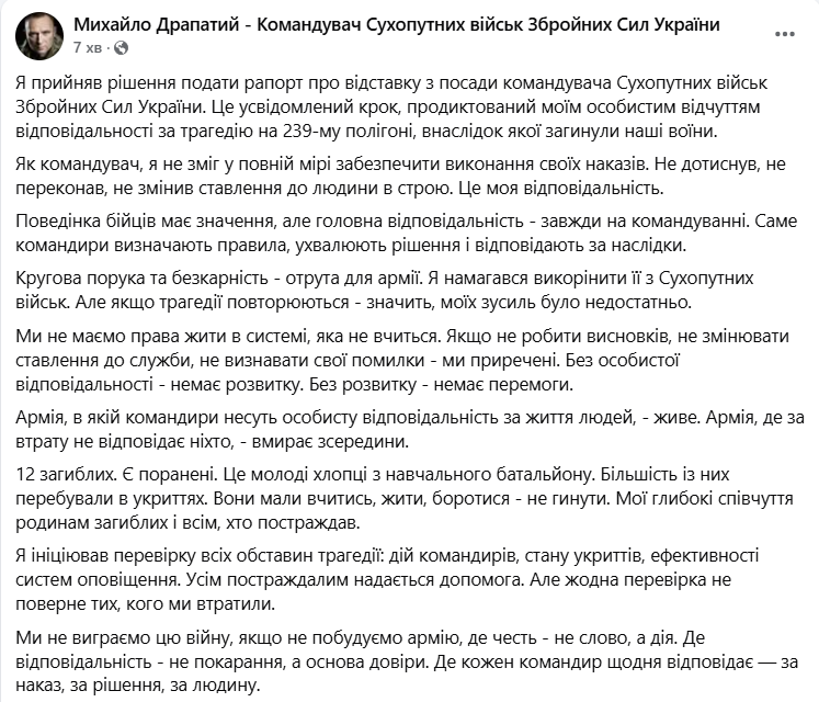 "Як командувач, я не зміг у повній мірі забезпечити виконання своїх наказів. Не дотиснув, не переконав, не змінив ставлення до людини в строю. Це моя відповідальність. Поведінка бійців має значення, але головна відповідальність - завжди на командуванні. Саме командири визначають правила, ухвалюють рішення і відповідають за наслідки", - написав він.