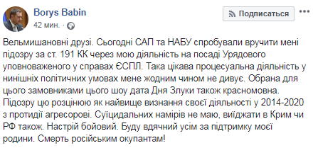 "Така цікава процесуальна діяльність у нинішніх політичних умовах мене жодним чином не дивує. Обрана для цього замовниками цього шоу дата Дня Злуки також красномовна. Підозру цю розцінюю як найвище визнання своєї діяльності у 2014-2020 з протидії агресорові. Суїцидальних намірів не маю, виїжджати в Крим чи РФ також", - заявив Бабін.