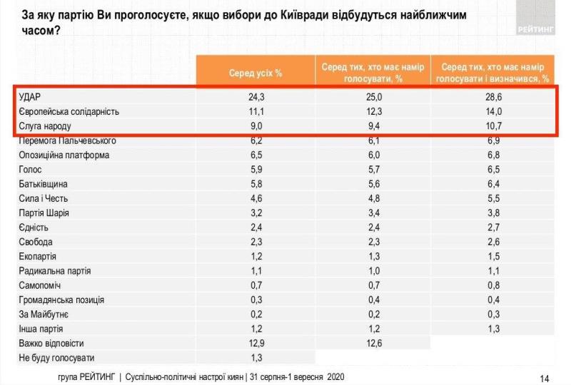 "У рейтингу політичних сил на виборах до міської ради лідером є партія "УДАР" за яку готові віддати голоси 28,6% тих, хто визначився і має намір прийти на вибори. Партію "Європейська солідарність" підтримують 14,0% опитаних, партію "Слуга народу" – 10,7%", – повідомляє "Рейтинг".