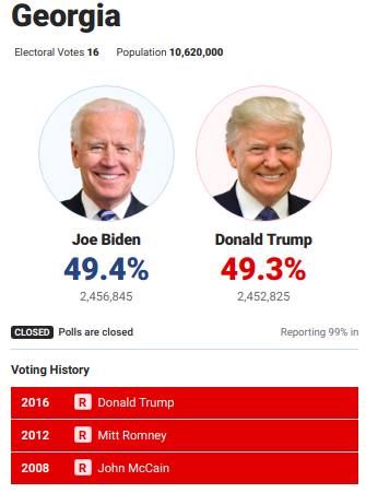 5 листопада місцеві влади заявили, що підрахунок голосів у штаті Джорджія завершиться через 10 днів після дня голосування, тобто 13 листопада.