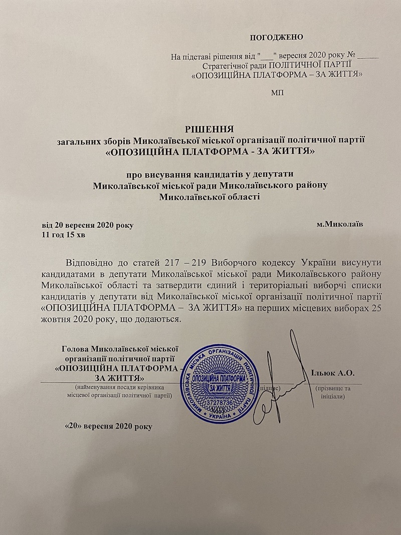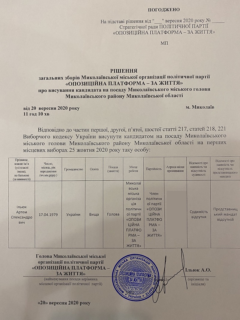 Міська партійна організація "Опозиційна платформа - За життя" висунула Артем Ільюка кандидатом в мери Миколаєва.