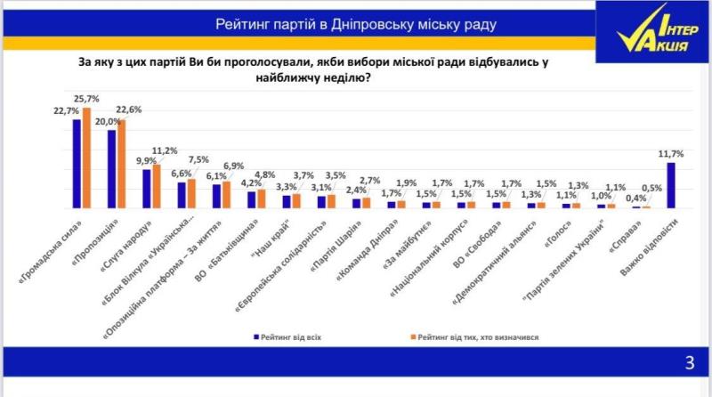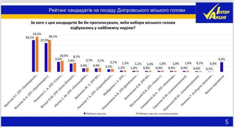 Зокрема, раніше на сайті Інституту публічної політики та консалтингу "Інпол" були оприлюднені результати дослідження переваг жителів Дніпра на замовлення інституту Центром суспільного розвитку "Інтер-акція". Результати показали, що Борис Філатов поступається Загіду Краснову. Відповідаючи на питання: "За яку з цих партій Ви б проголосували, якби вибори міської ради відбувалися найближчої неділі?" 25,7% серед тих, хто визначився з вибором партії, обрали партію "Громадська сила", на другому місці - "Пропозиція" з 22,6%. На третьому місці йде президентська партія "Слуга народу" з 11,2%.