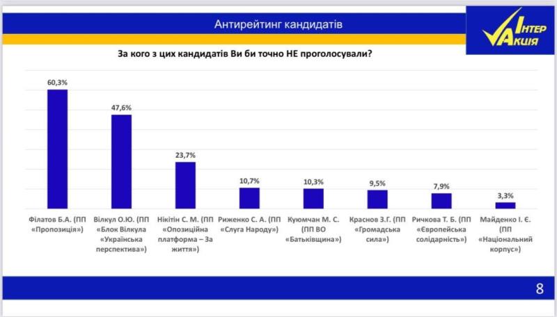 Лідером антирейтингу став Борис Філатов, з 60,3% голосів "нелюбові" дніпрян, другий - його колишній опонент на виборах мера Олександр Вілкул з 47,6%, на третьому - Сергій Нікітін. Далі - Сергій Риженко з 10,7%, Мгер Куюмчян з 10,3%. У Краснова антирейтинг 9,5%. З огляду на високий антирейтинг мера, його опонент Загід Краснов має шанси на перемогу на виборах.