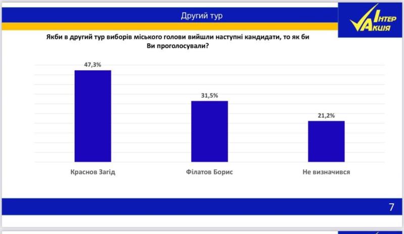 Якщо говорити про мерські вибори - жоден з кандидатів в першому турі не набирає більше половини голосів городян. 33,2% серед тих, хто визначився з вибором, підтримують Загіда Краснова - лідера партії "Громадська сила". Мера Бориса Філатова - 30,1% виборців. Далі, з триразовим відставанням йде кандидат від "Слуга народу" Сергій Риженко. У другому турі 47,3% респондентів обрали б Загіда Краснова, а 31,5% дніпрян - Бориса Філатова. 21,2% респондентів не визначилися.