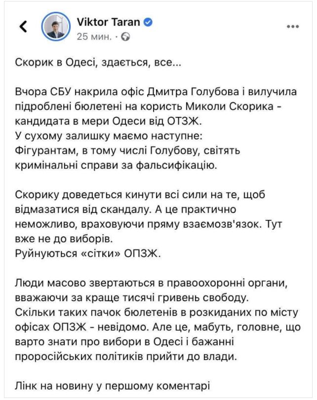 "Скорик в Одесі, здається, все... Вчора СБУ накрила офіс Дмитра Голубова і вилучила підроблені бюлетені на користь Миколи Скорика - кандидата в мери Одеси від ОПЗЖ. У сухому залишку маємо наступне: фігурантам, в тому числі Голубову, світять кримінальні справи за фальсифікацію. Скорику доведеться кинути всі сили на те, щоб відмазатися від скандалу. А це практично неможливо, враховуючи прямий взаємозв'язок. Тут вже не до виборів", - пише політтехнолог.
