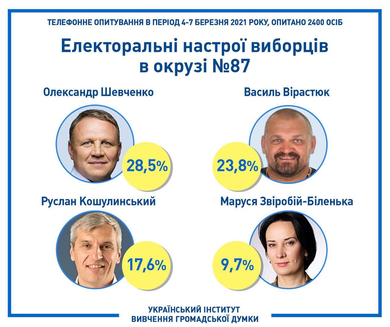 В Києві були презентовані результати соціологічного дослідження Українського інституту вивчення громадської думки по одномандатному виборчому окрузі № 87, лідирують двоє кандидатів - Олександр Шевченко, за якого готові проголосувати 28,5% з опитаних, та Василь Вірастюк, якого підтримують 23,8% виборців. На третьому місці Руслан Кошулинський – 18,6%, а на четвертому Маруся Звіробій – 9,7%. Загалом за місце в парламенті змагаються 15 кандидатів.