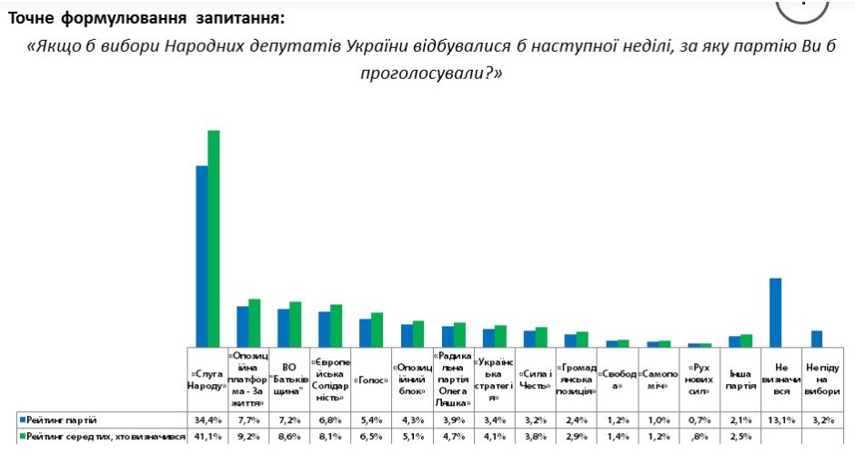 Відповідаючи на запитання "Якщо б вибори Народних депутатів України відбувалися б наступної неділі, за яку партію Ви б проголосували?", 34,4% опитаних (41,1% серед тих, хто визначився з вибором парті), відповіли, що виберуть партію "Слуга народу". На другому місці, з більше ніж чотириразовим відставанням від лідера з 7,7% (9,2% від тих, хто визначився) – "Опозиційна платформа – За життя". На третьому місті, з відставанням в границях похибки, ВО "Батьківщина" з 7.2% (8,6%) голосів. Далі йдуть – "Європейська солідарність" з 6,8% (8,1%), "Голос" з 5,4% (6,5%). Наближається до прохідного бар"єру "Опозиційний блок" з 4,3% (5,1%), "Радикальна партія О. Ляшка" з 3,9% (4,7%), "Українська стратегія" з 3,4% (4,1%), "Сила і честь" з 3,2% (3,8%). Інші партії отримують менше 3%. Ще 13,1% опитаних не визначились з вибором, а 3,2% не будуть брати участь у виборах.