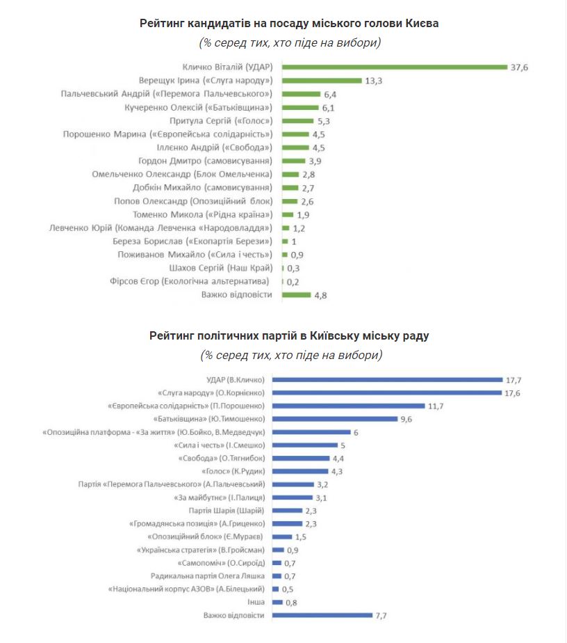 Лідером мерської гонки залишається чинний градоначальник Віталій Кличко. За нього готові проголосувати 37,6% киян. Друге місце у кандидата від "Слуги народу" Ірини Верещук, яка набирає 13,3% і виходить у другий тур.