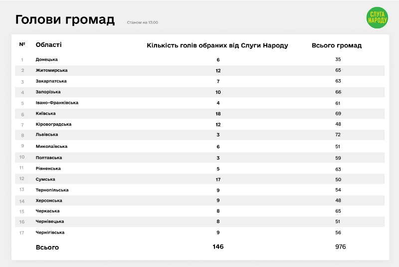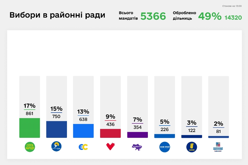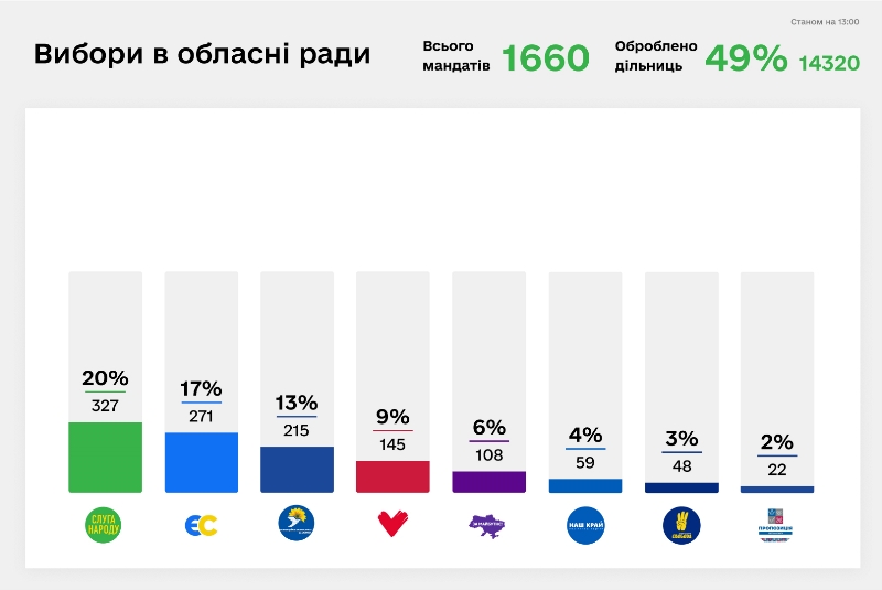 За попередніми даними паралельного підрахунку голосів, проведеного партією, "Слуга Народу" отримала 20% мандатів до обласних рад (партія "ЄС" – 17%, ОПЗЖ – 13%). У районних радах партія "Слуга Народу" має трохи менший відсоток, але все одно лідирує із 17% з 5300 мандатів. Крім того, за наявною інформацією із 17 областей, громади обрали 146 голів – представників "Слуги Народу" (15%).