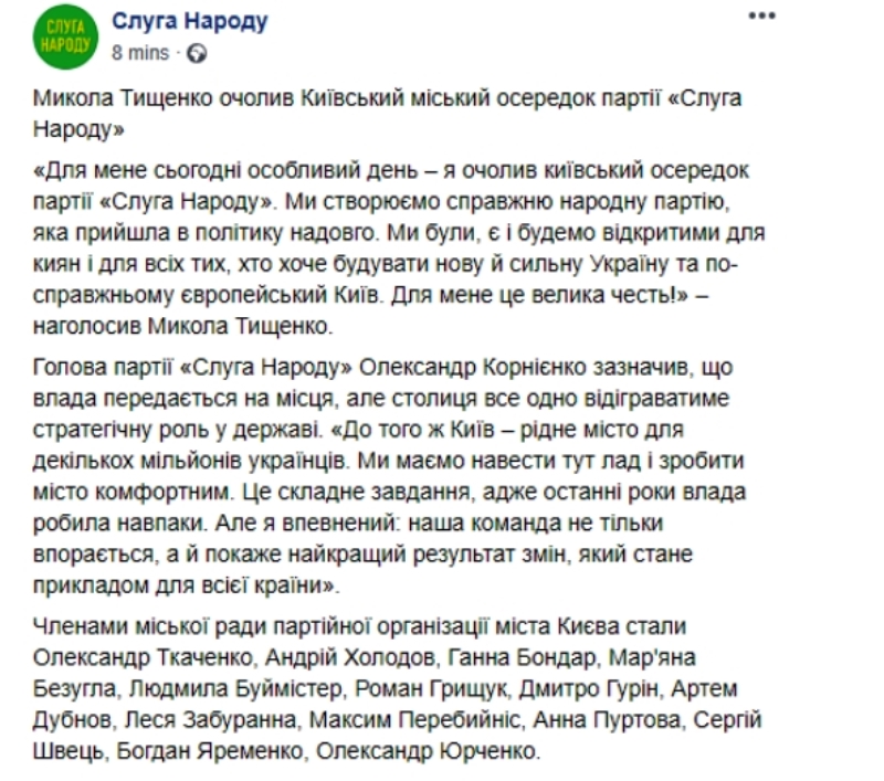 Народний депутат Микола Тищенко очолив столичне відділення партії "Слуга народу". До Київської міської ради політсили увійшли так само такі депутати, як Олександр Ткаченко, Богдан Яременко та інші.
