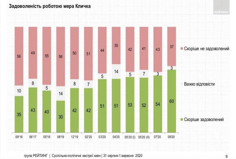 Разом з тим, 60% опитаних задоволені діяльністю міського голови Віталія Кличка. Показники задоволеності роботою мера столиці мають позитивну динаміку.