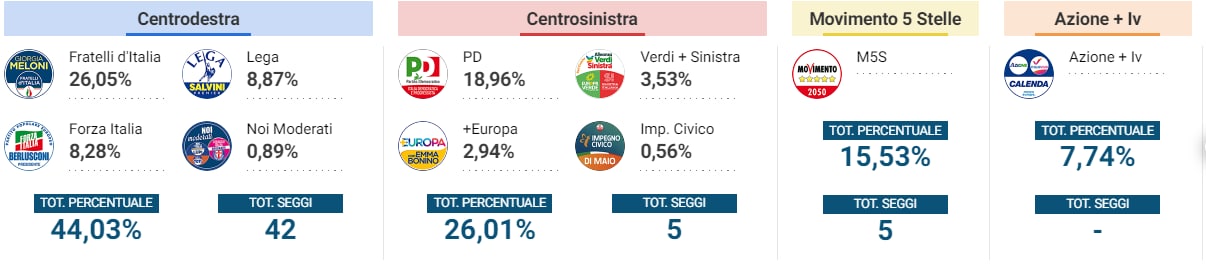 Права коаліція партій "Брати Італії", "Ліга", "Вперед, Італія" та "Ми помірні" набрала 44,03% (у тому числі "Брати Італії" - 26,05%, "Ліга" - 8,87% , "Вперед, Італія" - 8,28%)