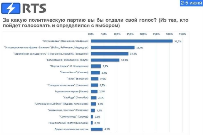 Інші політичні партії мають значно менші шанси на проходження в наступний склад Верховної Ради: "Партія Шарія" - 3,8%, "Сила і честь" - 3,4%, "Голос" - 2,9%, "Громадянська позиція" - 2,7%, Радикальна партія Олега Ляшка - 2,5%, "Свобода" - 2,1%, "Опозиційний блок" - 1,9%, "Українська стратегія Гройсмана" - 1,5%, "Самопоміч" - 0 , 8%, "Національний корпус" - 0,7%.