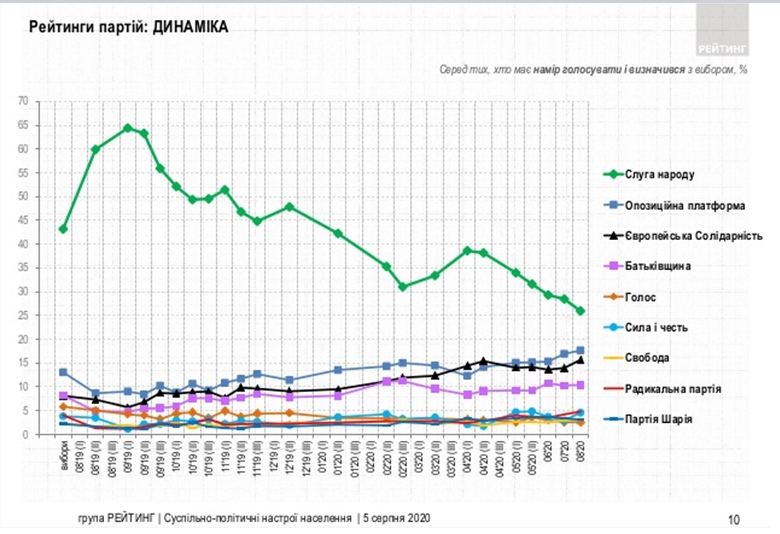 Показовою є динаміка рейтингів, наведена соціологічною групою. Так, найбільше і найшвидше падіння демонструє партія Зеленського. При цьому для решти партій з групи лідерів соціологи фіксують поступове зростання.
