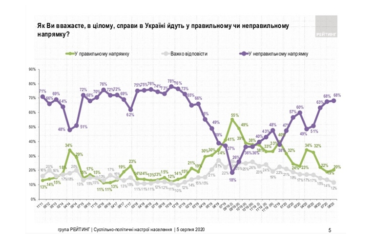 Так само збільшується кількість незадоволених ситуацією в країні. Лише кожен п"ятий українець нині вважає, що справи в Україні ідуть у правильному напрямку.