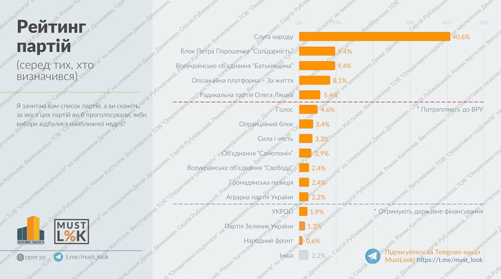 Їх електоральні симпатії розподілилися наступним чином: "Слуга народу" – 40,6%, "Європейська Солідарність" (екс-БПП) – 9,4%, ВО "Батьківщина" – 9,4%, "Опозиційна платформа – "За життя" – 8,1%, "Радикальна партія" Олега Ляшка – 5,4%, партія "Голос" – 4,6%, "Опозиційний блок" – 3,4%, "Сила і Честь" – 3,3%, "Самопоміч" – 2,4%, "Громадянська позиція" – 2,4%.
