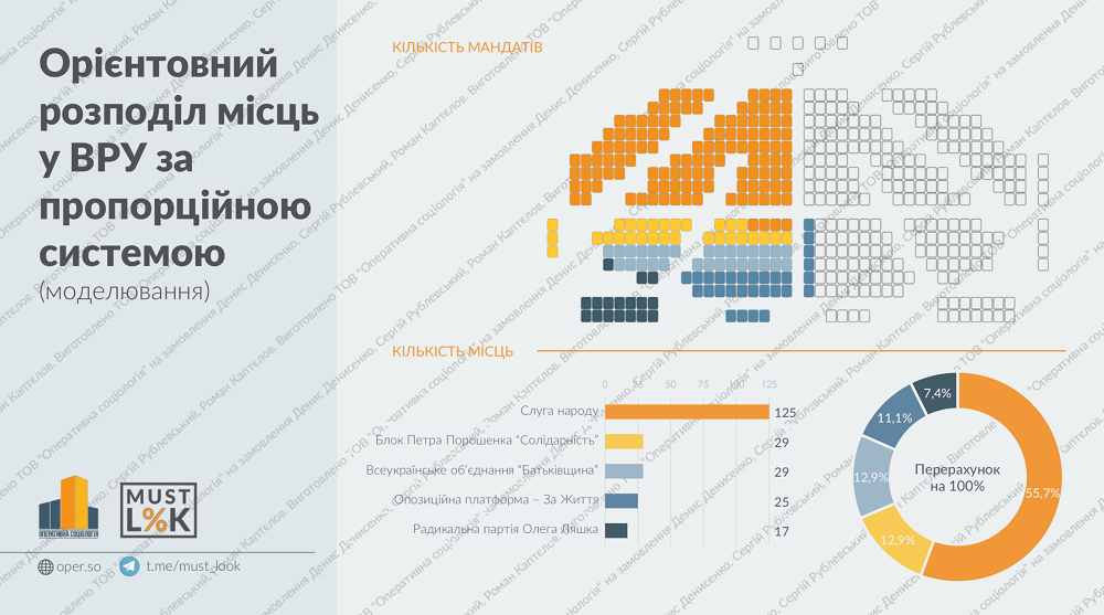Партія чинного президента отримає 125 місць, "Європейська Солідарність" Петра Порошенка та "Батьківщина" – по 29, "Опозиційна платформа – За життя" матиме 25, а "Радикальна партія" Ляшка – 17 місць.