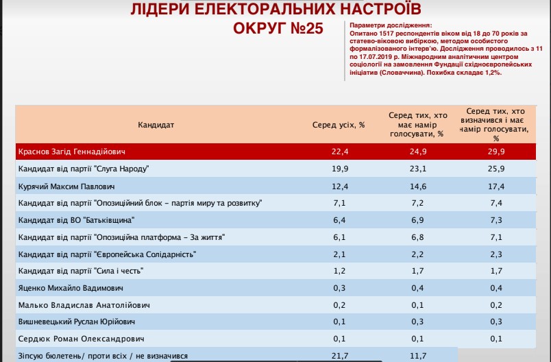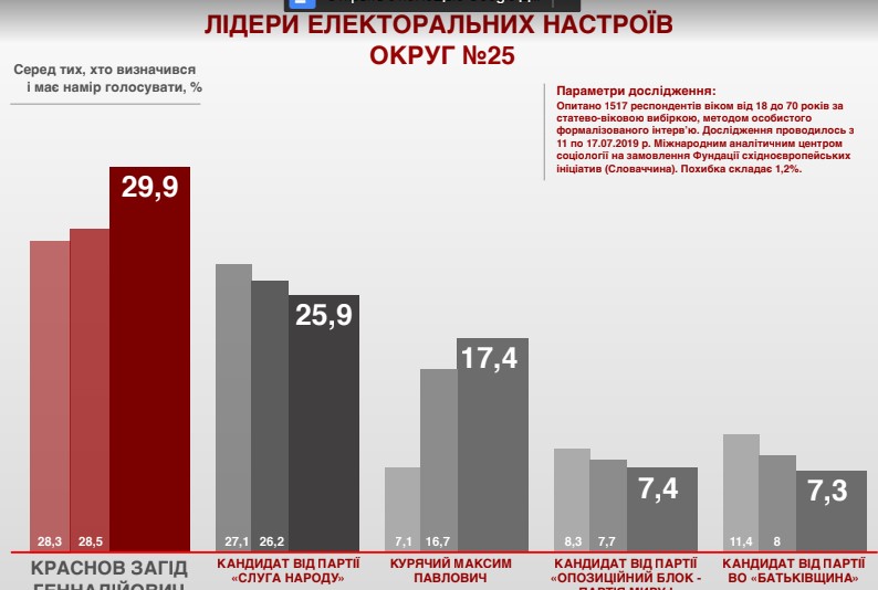 Показники Загіда Краснова серед тих, хто вже визначився, складають 29,9%. Тоді як у представника партії "Слуга народу" 25,9%. Значно відстав від них серед виборців округу Максим Курячий – чинний нардеп від БПП. Рівень його підтримки складає 17,4%.