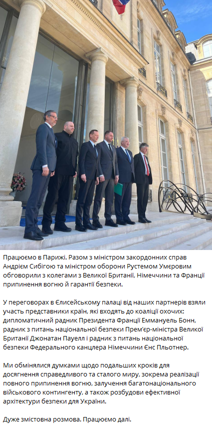 "Працюємо в Парижі. Разом з міністром закордонних справ Андрієм Сибігою та міністром оборони Рустемом Умєровим обговорили з колегами з Великої Британії, Німеччини та Франції припинення вогню й гарантії безпеки", - повідомив Єрмак.