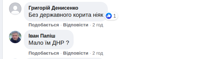 "Чергове щупальце російської гідри. Чим більше витягнуть з Росії грошей, тим краще", "Правильна назва - Україна наша дійна корова", "Без державного корита ніяк", "Мало їм ДНР", - пишуть коментатори.