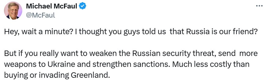 "Гей, зачекайте хвилинку? Мені здавалося, ви казали, що Росія – наш друг? Якщо ви дійсно хочете послабити російську загрозу, надішліть більше зброї в Україну і посильте санкції. Набагато дешевше, ніж купувати або вторгатися в Гренландію", – заявив Макфол.