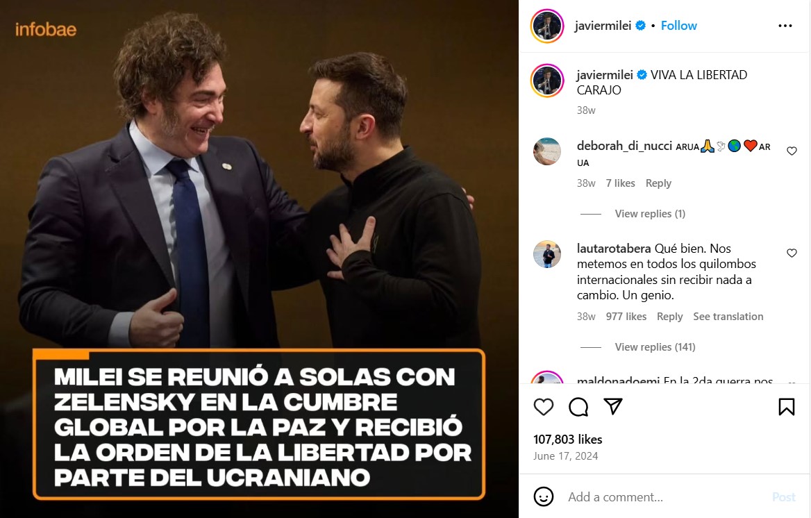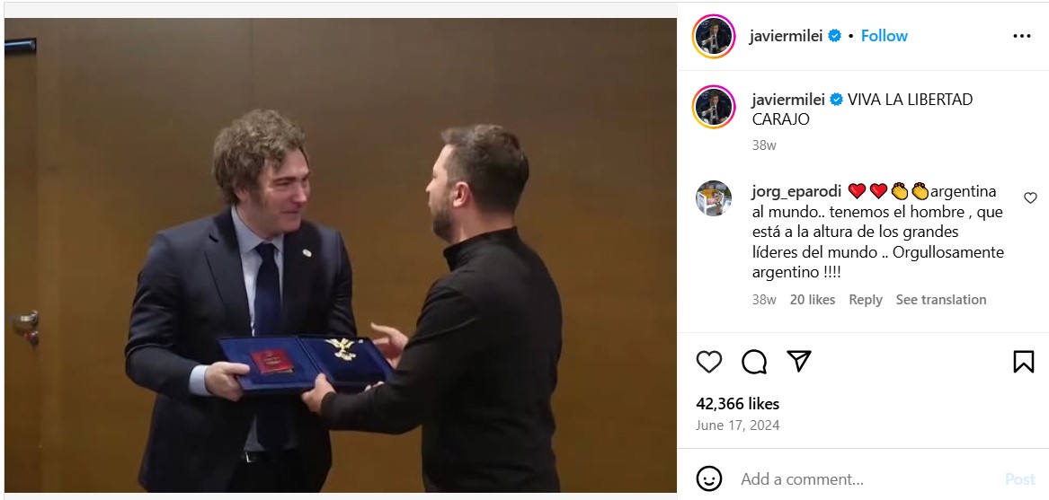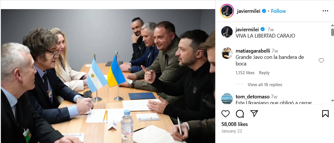 У березні 2025 року в Telegram-каналах почали поширюватися повідомлення про те, що президент Аргентини Хав"єр Мілей видалив всі фото з украънським президентом Володимиром Зеленським на знак підтримки президента США.