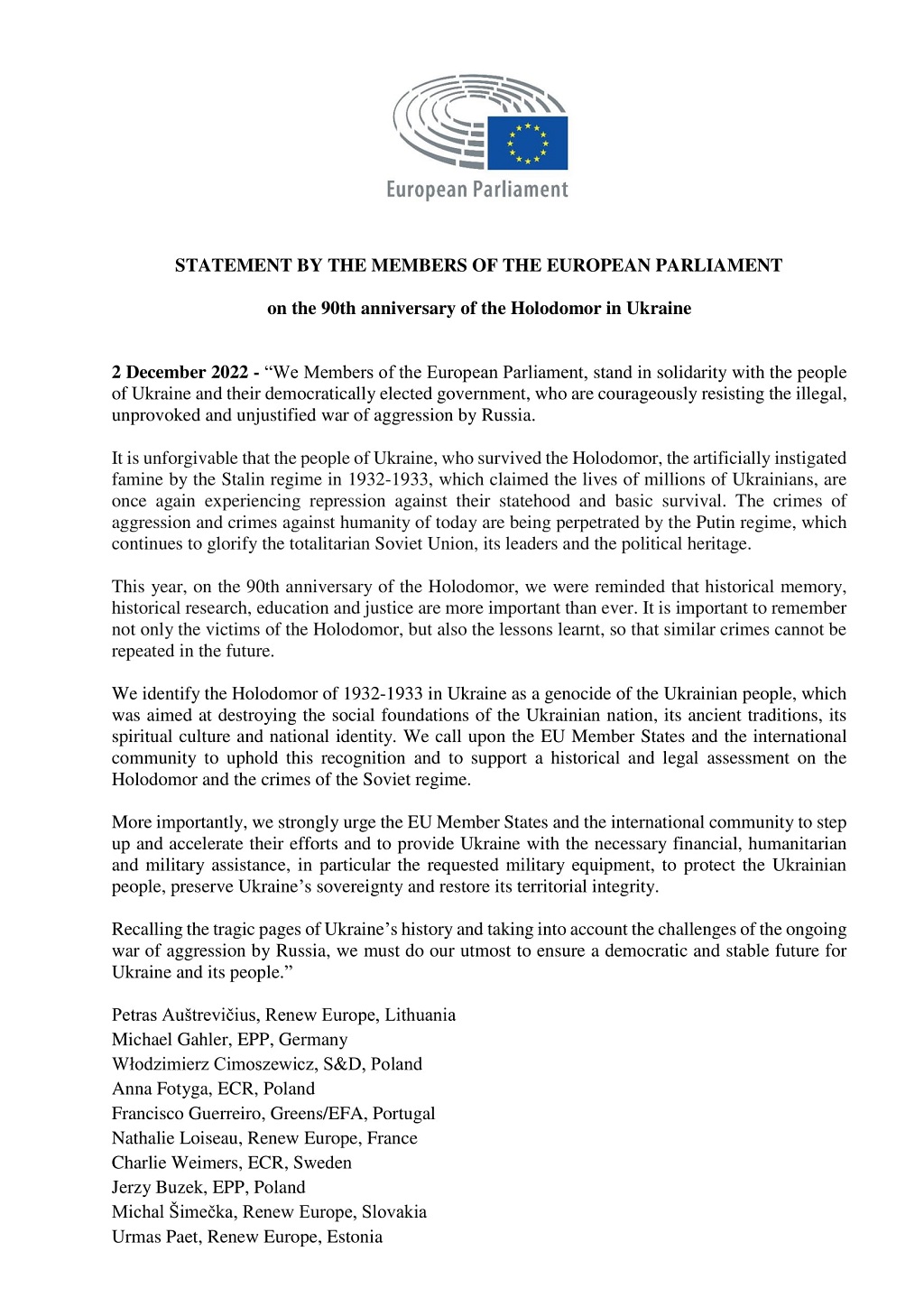 "Ми визначаємо Голодомор 1932-1933 в Україні як геноцид українського народу, який був спрямований на руйнування соціальних основ української нації, її давніх традицій, духовної культури та національної самосвідомості. Ми закликаємо держави-члени ЄС підтримати це визнання та підтримати історичну та правову оцінку Голодомору, та злочинів радянської влади", - йдеться у заяві.