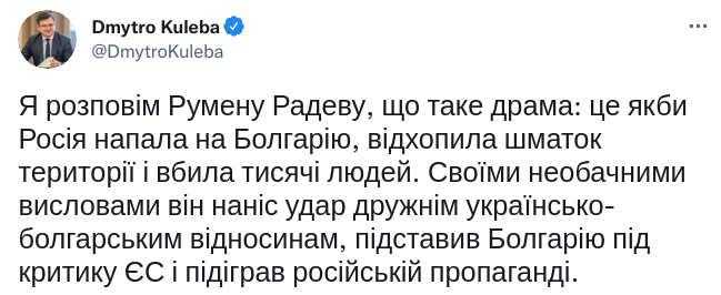 На заяву Радєва відреагував у своєму Twitter глава МЗС України Дмитро Кулеба.