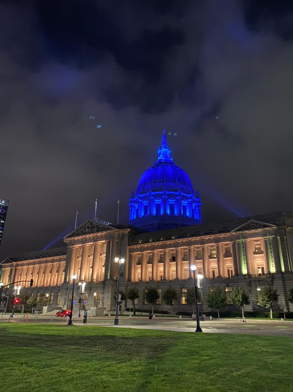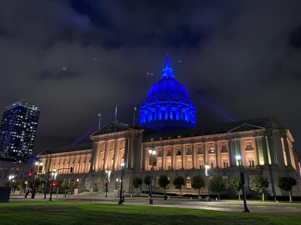 В рамках робочого візиту до США президент України Володимир Зеленський прибув до Каліфорнії. Його зустріли підсвічуванням в кольорах українського прапора будівлі мерії міста Сан-Франциско.