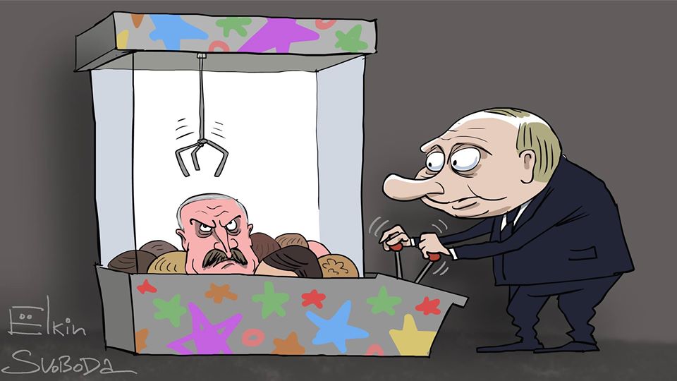 На ньому президент РФ Володимир Путін стоїть біля іграшкового автомату. Якщо вправно керувати таким пристроєм, то спеціальна "лапка" зачепить іграшку, підніме вгору й віддасть власнику. Тільки замість іграшкових звіриків у Путіна під рукою голови міжнародних політиків. Президента Білорусі він уже майже витягнув із цієї купи.