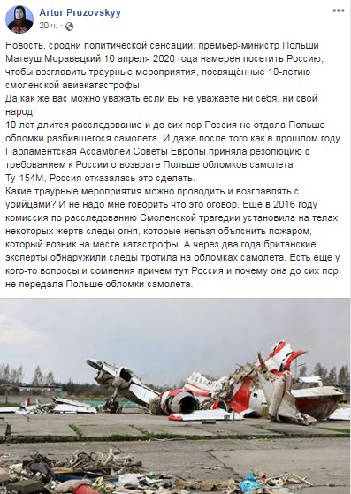 "Новина, на кшталт політичної сенсації: прем'єр-міністр Польщі Матеуш Моравецкій 10 квітня 2020 року має намір відвідати Росію, щоб очолити жалобні заходи, присвячені 10-річчю смоленської авіакатастрофи. Як же вас можна поважати, якщо ви не поважаєте ні себе, ні свій народ! 10 років триває розслідування і до сих пір Росія не віддала Польщі уламки літака, що розбився. Навіть після того як Парламентська Асамблеї Ради Європи прийняла резолюцію з вимогою до Росії про повернення Польщі уламків літака Ту-154М, Росія відмовилася це зробити. Які жалобні заходи можна проводити і очолювати з вбивцями? Не треба мені говорити, що це обмова. У 2016 році комісія з розслідування Смоленської трагедії встановила на тілах деяких жертв сліди вогню, які не можна пояснити пожежею, яка виникла на місці катастрофи. А через два роки британські експерти виявили сліди тротилу на уламках літака. Є ще у кого-то питання і сумніви причому тут Росія і чому вона досі не передала Польщі уламки літака", - написав блогер.