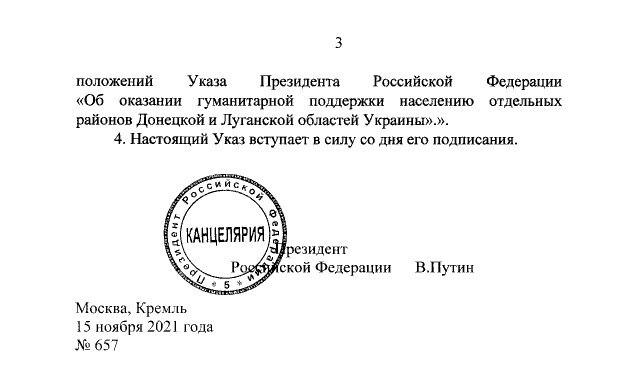 Президент РФ Володимир Путін у понеділок, 15 листопада, підписав указ про надання гуманітарної підтримки мешканцям окремих районів Донецької та Луганської областей України.