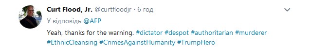 "Спасибі, що попередили", - написав Curt Flood в Twitter, позначивши своє повідомлення хештегами тиран, диктатор, вбивця, злочини проти людяності.