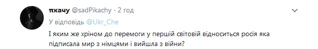 "І яким же хр*ном перемога в Першій світовій війні стосується Росії, яка підписала мир з німцями і вийшла з війни?" - запитують користувачі соцмережі.