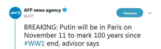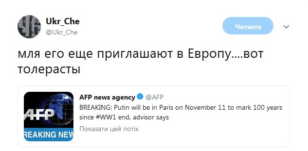 Запрошення президента Росії Володимира Путіна на урочистості з нагоди 100-річчя закінчення Першої світової війни (1914-1918 рр), які з 11 по 13 листопада пройдуть в столиці Франції Парижі, викликало обурення в мережі.